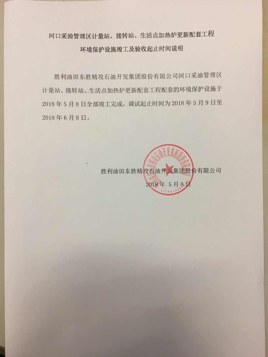 河口采油管理區(qū)計(jì)量站、接轉(zhuǎn)站、生活點(diǎn)加熱爐更新配套工程環(huán)境保護(hù)設(shè)施竣工及驗(yàn)收起止時間說明